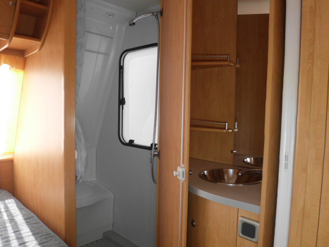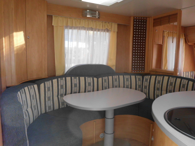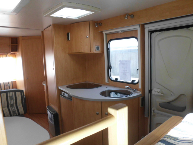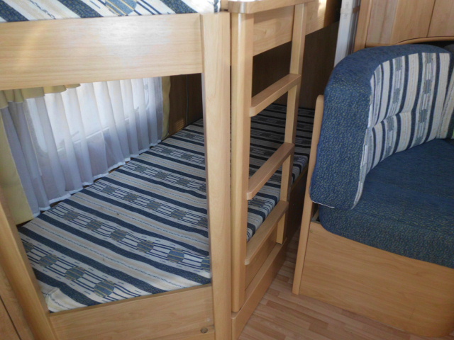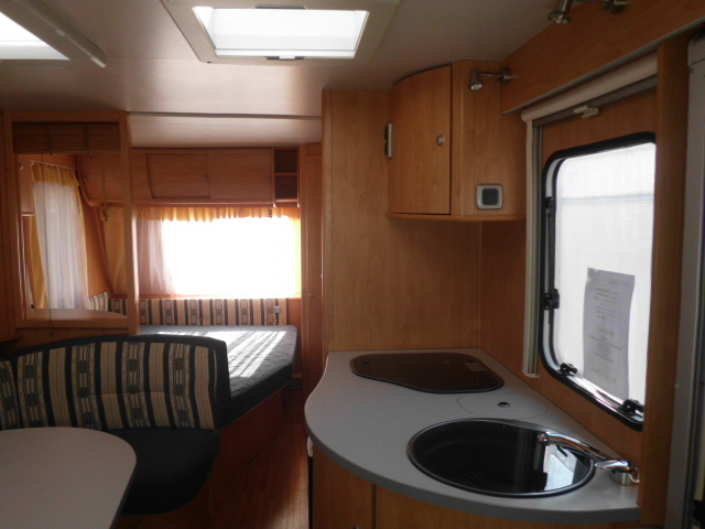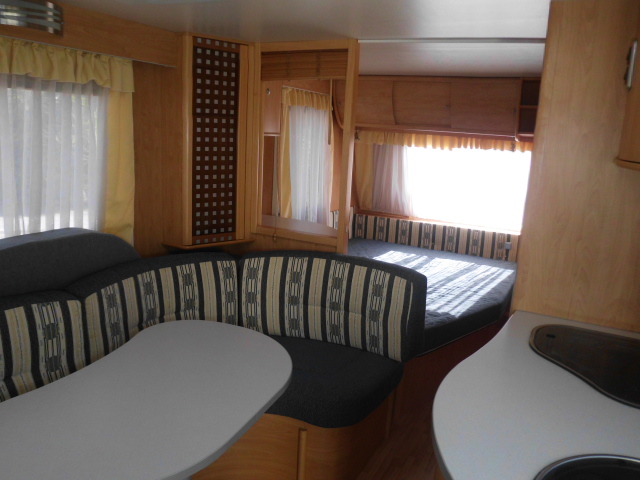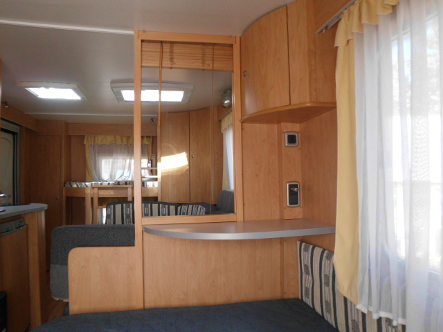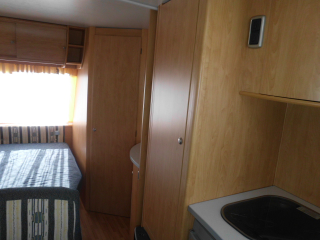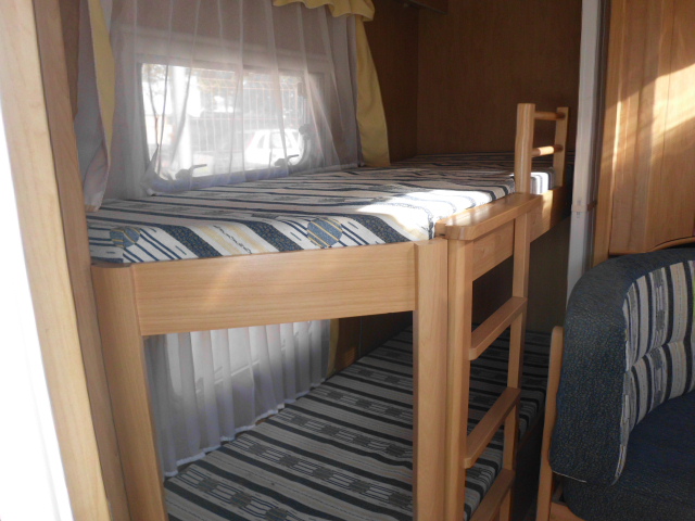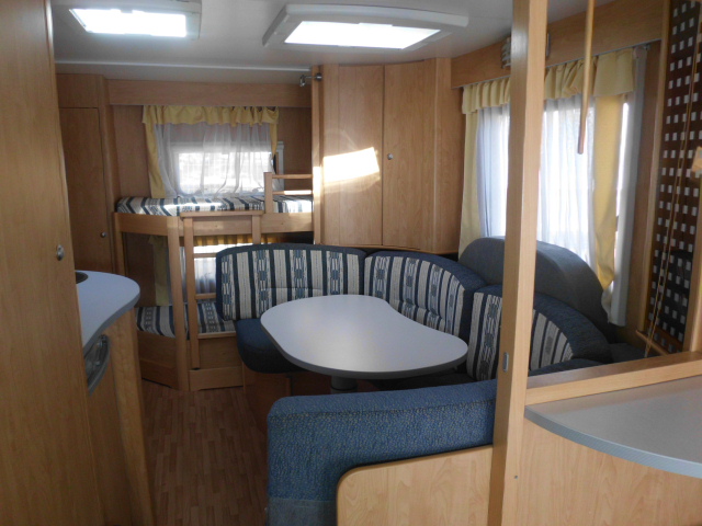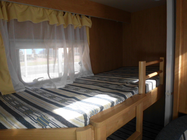 Consta de: cama de matrimonio fija, comedor convertible en cama de matrimonio y dos literas. Cocina con encimera, nevera y armarios varios
